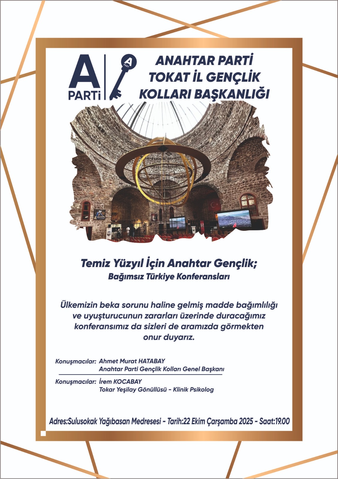 Etkinliğin ana teması, Tokat ve Türkiye genelinde artış gösteren madde bağımlılığıyla mücadele olurken, gençler üzerindeki etkiler, ailelerin ve toplumun rolü, yerel yönetimlerin sorumluluğu ve sivil toplum iş birlikleri gibi konular detaylı şekilde ele alınacak. Konferans, aynı zamanda bağımlılıkla mücadelede izlenebilecek somut adımları da gündeme taşıyacak.