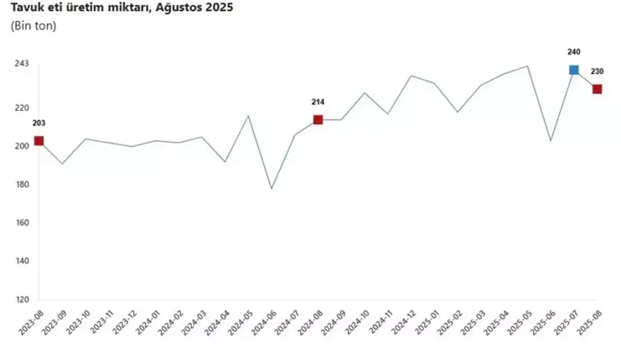Temmuz ayında 239 bin 876 ton olan tavuk eti üretimi, ağustos ayında yüzde 4,1 oranında azalarak 229 bin 965 tona geriledi. Öte yandan, tavuk yumurtası üretimi bir önceki aya göre yüzde 3,4 artarak 1 milyar 679 milyon 277 bin adede yükseldi.