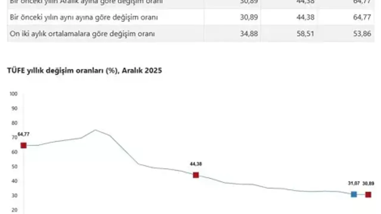 Açıklanan rakamlara göre, tüketici fiyat endeksi aralık ayında bir önceki aya göre yüzde 0,89 oranında artış gösterdi. Yıllık enflasyon ise yüzde 30,89 olarak gerçekleşti. On iki aylık ortalamalara göre hesaplanan enflasyon oranı ise yüzde 34,88 oldu.