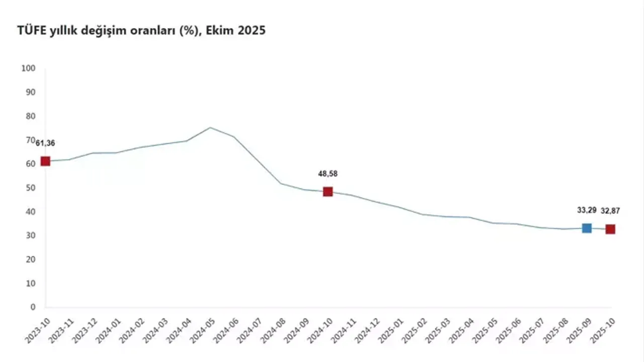 Yurt içi üretici fiyat endeksi (Yİ-ÜFE) ise Ekim ayında bir önceki aya göre yüzde 1,63, bir önceki yılın Aralık ayına göre yüzde 25,67, bir önceki yılın aynı ayına göre yüzde 27, 12 aylık ortalamalara göre ise yüzde 25,49 arttı.