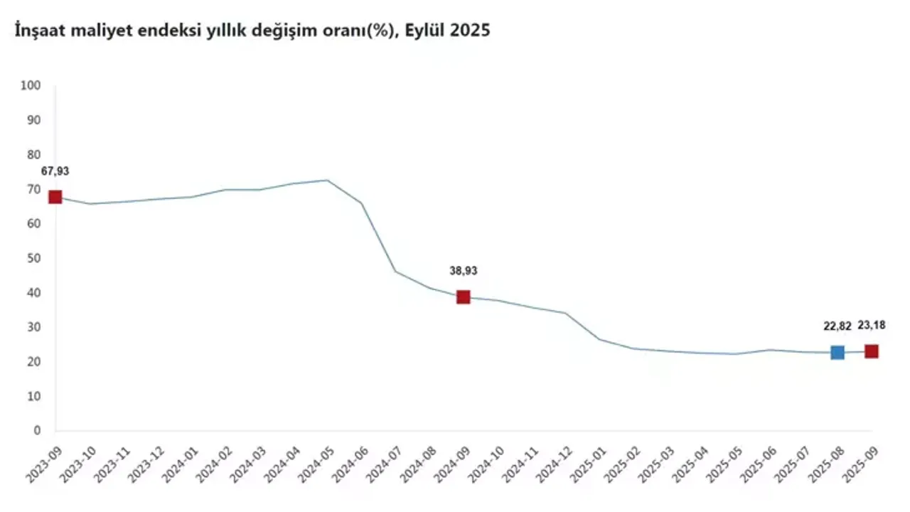 Buna göre, inşaat maliyet endeksi aylık yüzde 0,87, yıllık yüzde 23,18 artış gösterdi.