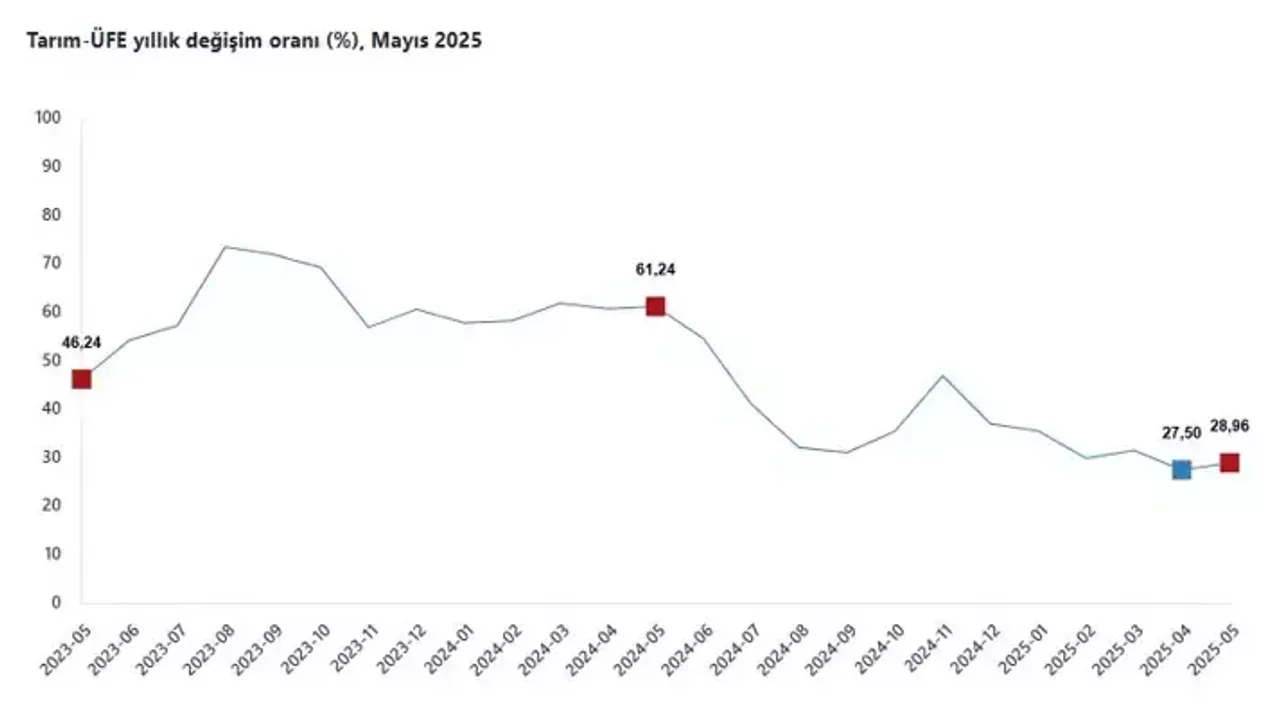 Açıklanan verilere göre, tarım üretici fiyatları yıllık bazda yüzde 28,96 oranında artarken, aylık bazda ise yüzde 0,23 oranında yükseldi. TÜİK'in verilerine göre, Tarım-ÜFE; Aralık 2024’e kıyasla yüzde 12,56, geçen yılın aynı ayına göre ise yüzde 28,96 arttı. 12 aylık ortalamalara göre artış oranı ise yüzde 35,21 olarak kaydedildi.