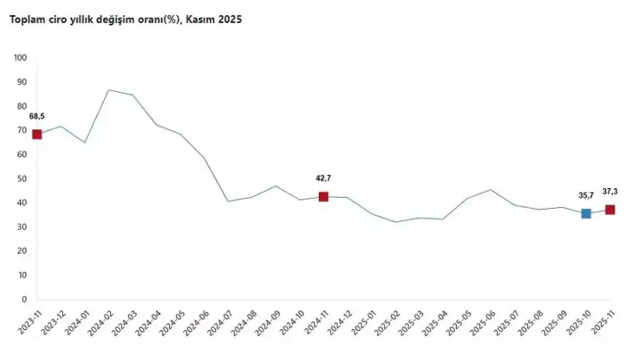 Ekonomik aktivitenin hızını gösteren aylık verilerde ise toplam ciro, ekim ayına göre yüzde 3,7 artış kaydetti. Aylık bazda en dikkat çekici performans, yüzde 8’lik yükselişle yine inşaat sektöründen geldi. Sanayi ciroları aylık yüzde 5,5 artarken, ticaret ve hizmet sektörlerindeki artış hızı yüzde 2,6 seviyesinde dengelendi.