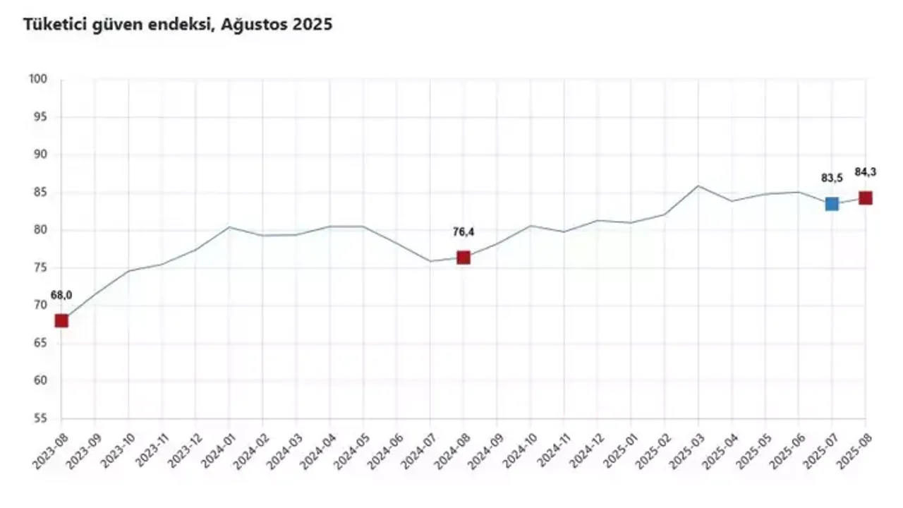 Buna göre, endeks bir önceki aya göre yüzde 0,9 artış göstererek 84,3 seviyesine yükseldi.