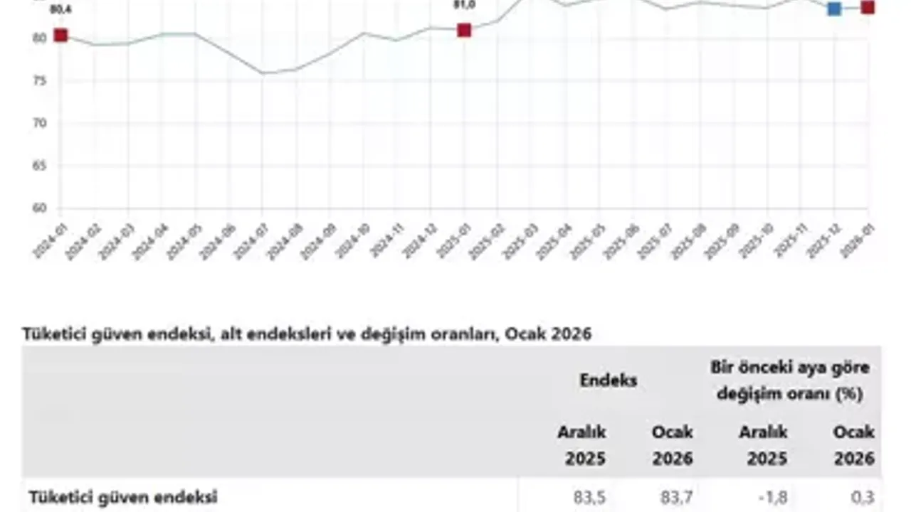 Açıklanan verilere göre, tüketici güven endeksi ocak ayında bir önceki aya kıyasla yüzde 0,3 oranında artış göstererek 83,7 seviyesine yükseldi. Endeksteki sınırlı artış, tüketici algısında temkinli iyimserliğin sürdüğüne işaret etti.