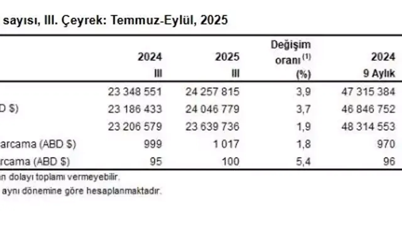 Turizm gideri, geçen yılın aynı çeyreğine göre yüzde 32,3 artarak 2 milyar 479 milyon 210 bin dolar olarak gerçekleşti. Bunun 2 milyar 34 milyon 647 bin dolarını kişisel harcamalar, 444 milyon 563 bin dolarını paket tur harcamaları oluşturdu. Yurt dışını ziyaret eden vatandaş sayısı ise yüzde 3 artışla 3 milyon 383 bin 353 kişi olurken, kişi başı ortalama harcama 733 dolar olarak kaydedildi.