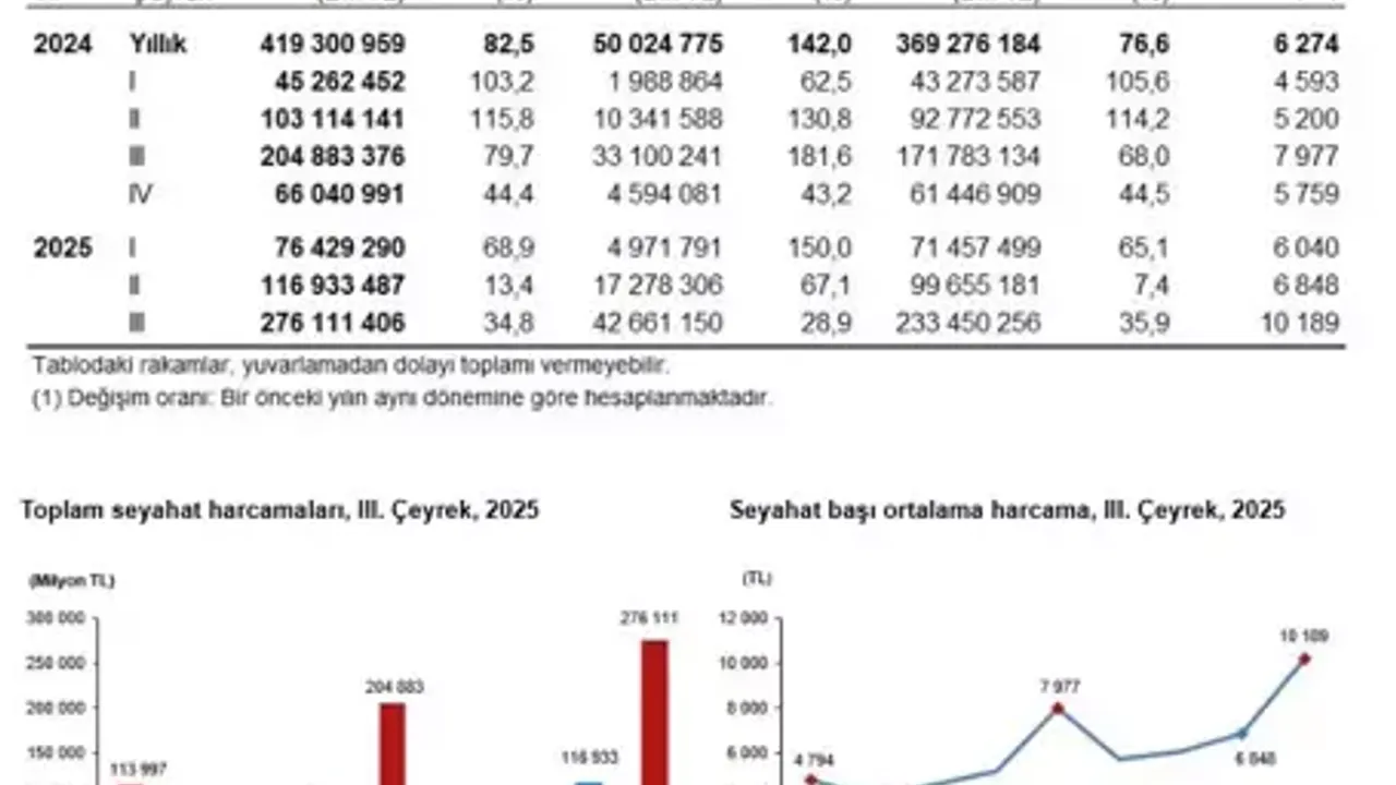 Temmuz, ağustos ve eylül aylarını kapsayan dönemde yurt içinde seyahate çıkan yerli turistlerin harcamaları bir önceki yılın aynı çeyreğine göre yüzde 34,8 artarak 276 milyar 111 milyon 406 bin TL’ye yükseldi.