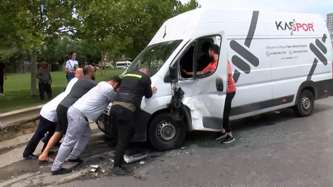 Motosiklet sürücüsüne yardım etmek için duran panelvana, arkadan gelen kamyonet ve servis minibüsü çarptı. Zincirleme kazada büyük panik yaşandı.